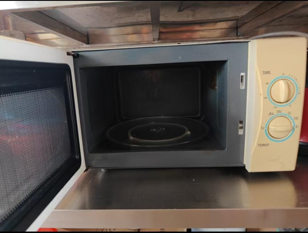 微波炉外观保持整洁,内胆干净无锈蚀,转盘运转顺畅,门封密闭良好。机械式旋钮操作简单直观,火力调节与时间设定反应准确。其加热效率与稳定性经过长期日常使用验证,能够快速均匀地完成食物加热。